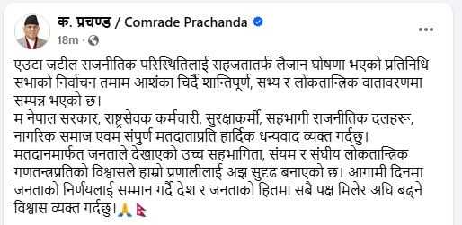 प्रचण्डले समाजिक सञ्जालमा लेख्दै नेपाल सरकार, राष्ट्रसेवक कर्मचारी, सुरक्षाकर्मी, सहभागी राजनीतिक दलहरू, नागरिक समाज तथा सम्पूर्ण मतदाताप्रति हार्दिक धन्यवाद व्यक्त गरेका छन् । उनका अनुसार मतदानमार्फत जनताले देखाएको उच्च सहभागिता, संयम र संघीय लोकतान्त्रिक गणतन्त्रप्रतिको विश्वासले देशको लोकतान्त्रिक प्रणालीलाई अझ सुदृढ बनाएको छ । उनले आगामी दिनमा जनताको निर्णयलाई सम्मान गर्दै देश र जनताको हितमा सबै पक्ष मिलेर अघि बढ्ने विश्वास व्यक्त गरेका छन् ।