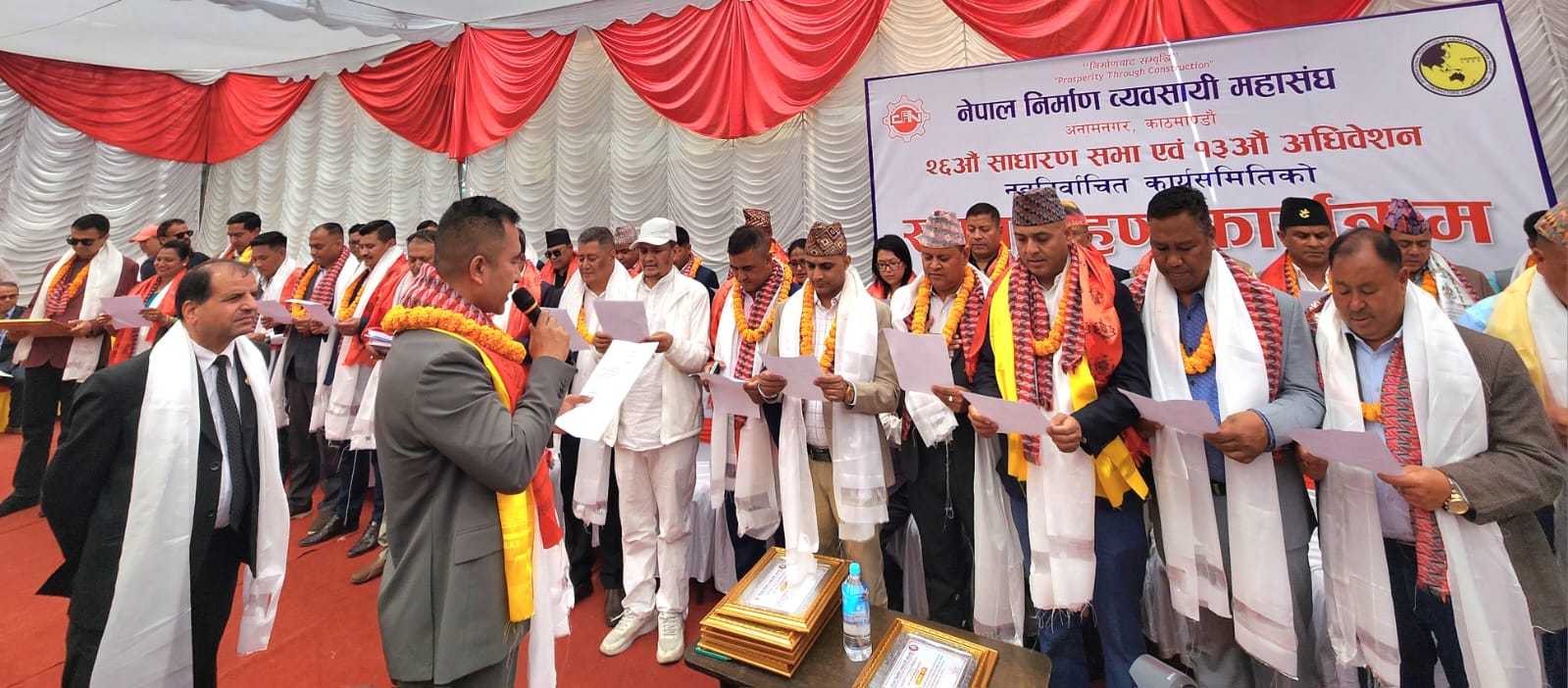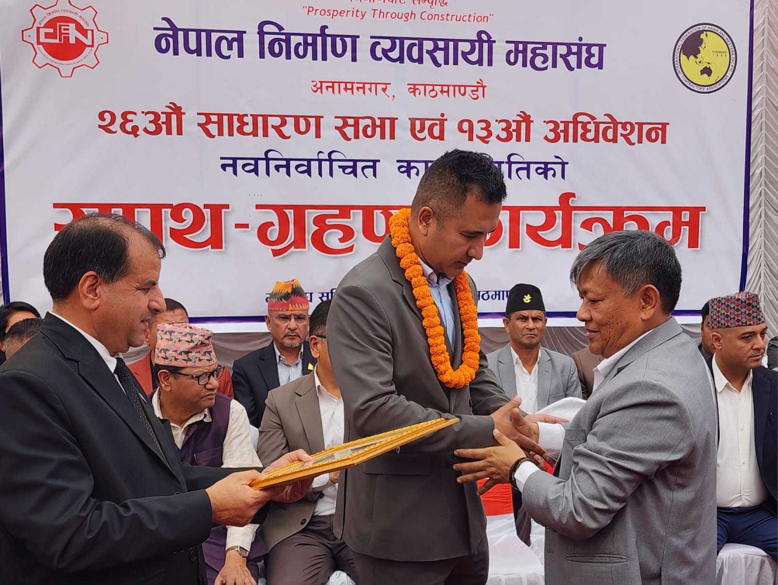 चैत्र २३, काठमाडौं । महासंघको हालै सम्पन्न २६ औं साधारण सभा एवं १३औं अधिवेशनबाट निर्वाचित अध्यक्ष, पदाधिकारी एवं कार्य समिति सदस्यहरूले पद तथा गोपनियताको सपथ लिँदै कार्यभार ग्रहण गरेका छन् । मुख्य निर्वाचन अधिकृत वरिष्ठ अधिवक्ता टंक प्रसाद दुलालले नवनिर्वाचित कार्य समितिका पदाधिकारीहरूलाई सपथ गराउनु भएको हो । सपथपछिको सभालाई सम्बोधन गर्दै महासंघका नवनिर्वाचित अध्यक्ष निकोलस पाण्डेले आफू कर्ममा विश्वास गर्ने व्यक्ति भएको बताउँदै सबै तह र तप्काका निर्माण व्यवसायीहरूको वृद्धि विकासका लागि इमान्दार भएर काम गर्ने प्रतिबद्धता जनाउनुभयो । विभागीय मन्त्रीसँगको छलफलमा आफूले निर्माण उद्योगमा विद्यमान समस्याहरूबारे जोडदार रुपमा ध्यानाकर्षण गराएको जानकारी गराउँदै अध्यक्ष पाण्डेले क्रमशः सकारात्मक परिणाम आउने विश्वास व्यक्त गर्नुभयो । सपथ ग्रहण समारोहमा निवर्तमान अध्यक्ष रवि सिंह, निवर्तमान वरिष्ठ उपाध्यक्ष आङ दोर्जी लामा (ए.डी) लगायतले निर्माण उद्योगको बृहत्तर हितका लागि आफूहरूको सदैव साथ सहयोग रहने धारणा व्यक्त गर्नुभयो ।